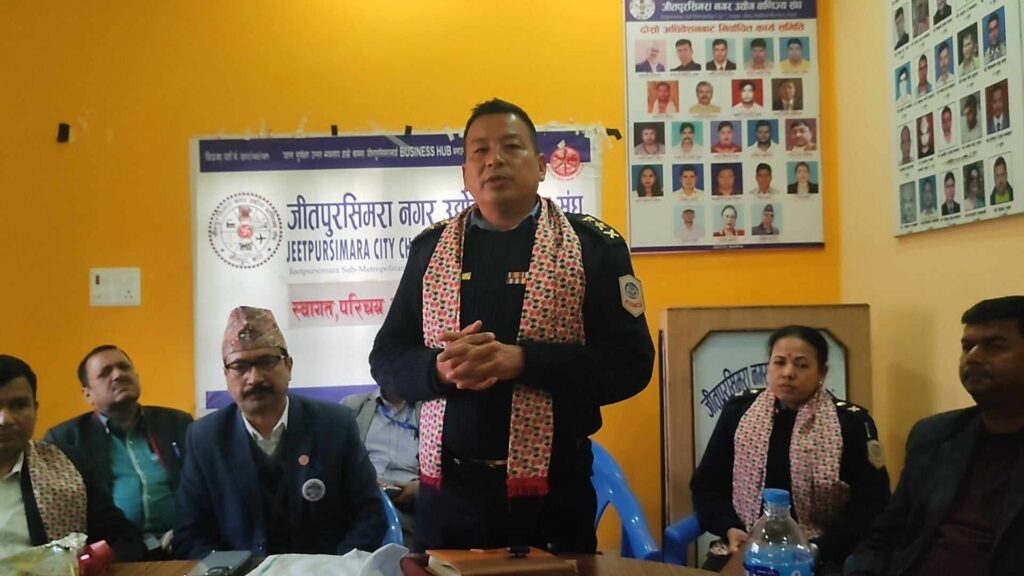 साथै जिल्लाको शान्ति, सुरक्षा कायम राख्न कटिबद्ध रहने र कानुन प्रावधानमा रहेर व्यापार व्यवसाय गर्न सबैमा अनुरोध गर्नुभयो ।जीतपुरसिमरा उद्योग वाणिज्य संघले सोमबार आयोजना गरेको स्वागत परिचय तथा अन्तरक्रिया कार्यक्रममा बोल्दै प्रहरी उपरीक्षक तामाङ्गले सुरक्षा बिना विकास र सम्वृद्धि सम्भव नभएको भन्दै आम व्यवसायी र नागरिकको सुरक्षामा कुनै कमि हुन नदिने समेत प्रतिबद्दता व्यक्त गर्नुभयो कार्यक्रमा जीतपुरसिमरा नगर उद्योग बाणिज्य संघका सदस्यहरुको सहभागिता रहेको थियो ।
