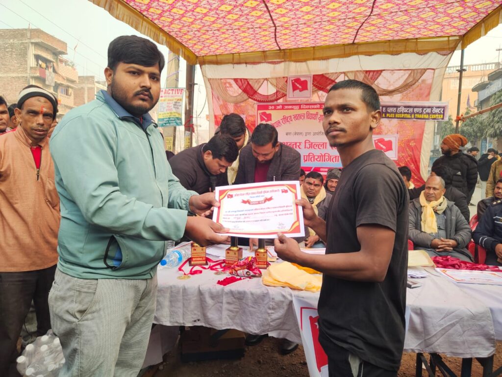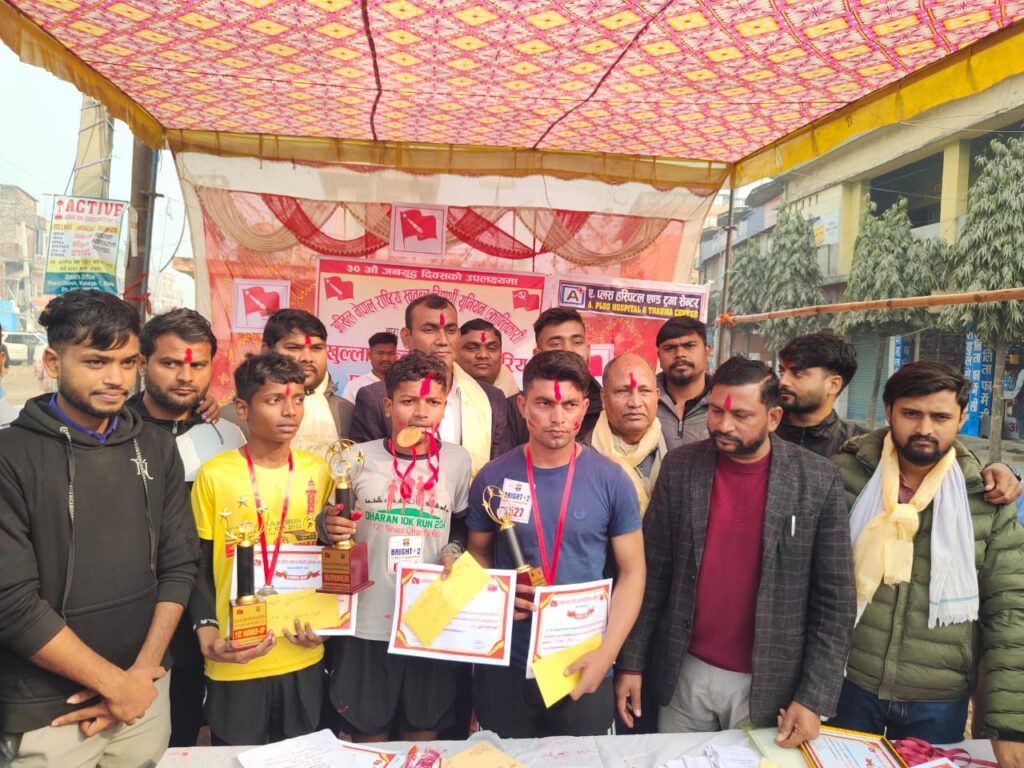 जनयुद्ध दिवसको अवसरमा अखिल नेपाल राष्ट्रिय स्वतन्त्र विद्यार्थी युनियन (क्रान्तिकारीले ) निकै छोटो समयमा प्रतियोगिताको तयारी गरेर सफलता पूर्वक दौड प्रतियोगिता सम्पन्न गरेकोमा धन्यावाद दिनुभयो ।अन्तर जिल्ला स्तरीय दौड प्रतियोगितामा प्रथम भएकालाई १० हजार दृतिय भएकालाई ५ हजार र तृतीय भएकालाई २५ सय नगद सहित प्रमाणपत्र ,शिल्ड मेडल प्रदान गरिएको अखिल नेपाल राष्ट्रिय स्वतन्त्र विद्यार्थी युनियन (क्रान्तिकारीका )बारा जिल्ला अध्यक्ष सन्दीप यादवले बताउनुभयो ।