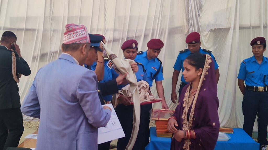 असोज ३१ कलैया : ७० औं प्रहरी दिवसको अवसरमा गत असार २४ गते रसुवामा आएको बाढीमा परेर ज्यान गुमाएका प्रहरी जवान मुन्ना ठाकुरकी परिवारलाई बारा प्रहरीले सम्मान गरेको छ । शुक्रबार जिल्ला प्रहरी कार्यालय बारामा आयोजित श्रद्धाञ्जली अपर्ण तथा विशेष कार्यक्रममा स्वर्गीय ठाकुरकी श्रीमती गुन्जा ठाकुरलाई दोसल्ला ओढाएर र नगद सहित सम्मान गरिएको हो ।