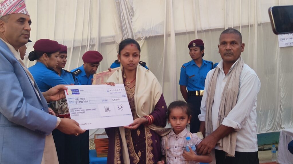 प्रहरी विपद तथा राहत कोषबाट प्राप्त ६ लाख रुपैयाँ बराबरको चेक प्रमुख अतिथि प्रमुख जिल्ला अधिकारी प्रकाश पौडेल र जिल्ला प्रहरी प्रमुख प्रहरी उपरीक्षक सन्तोष तामाङले संयुक्त रूपमा हस्तान्तरण गर्नुभयो । साथै, मधेश प्रदेश प्रहरी कार्यालयबाट प्राप्त ३५ हजार रुपैयाँ नगद समेत गुन्जा ठाकुरलाई प्रदान गरिएको थियो । फेटा गाउँपालिका–१ भलुही निवासी प्रहरी जवान ठाकुर गत असार २४ गते रसुवाको गोसाईकुण्ड गाउँपालिका–२ रसुवागढी क्षेत्रमा आएको बाढीका बेला उद्धार कार्यमा खटिएका क्रममा बेपत्ता भएका थिए ।
