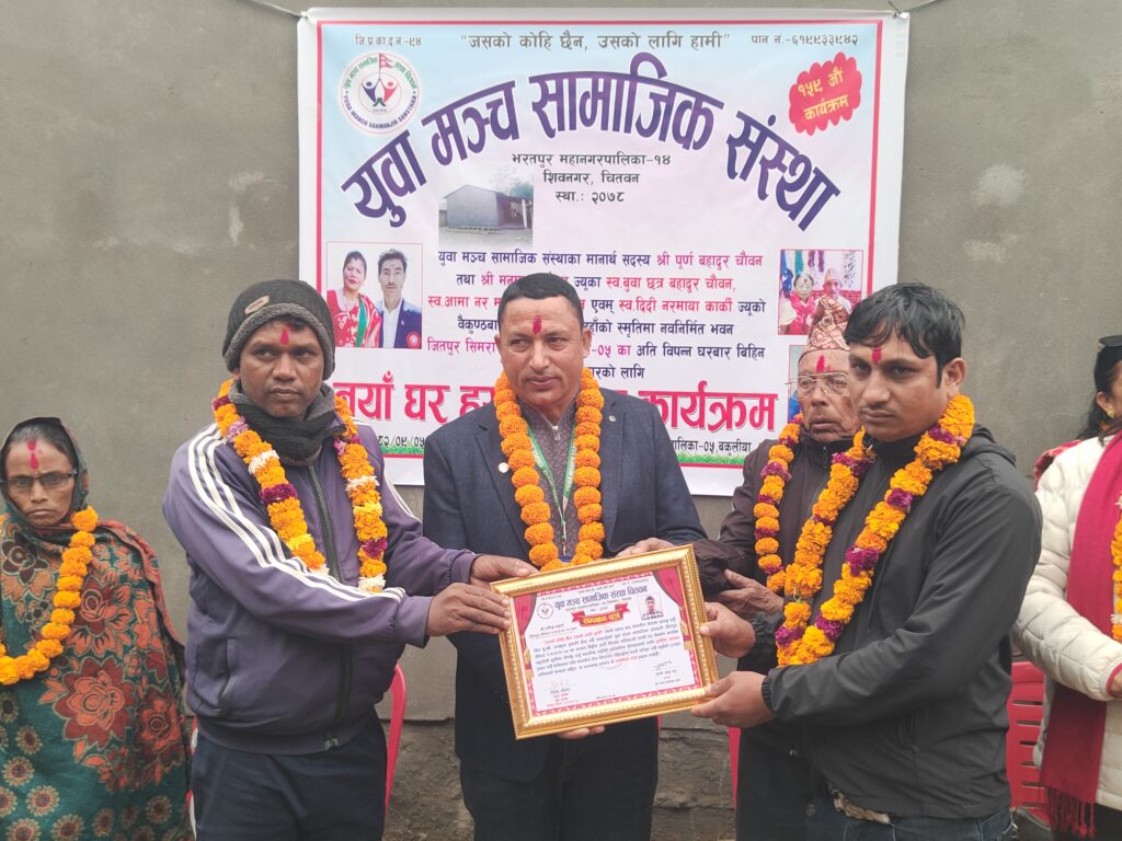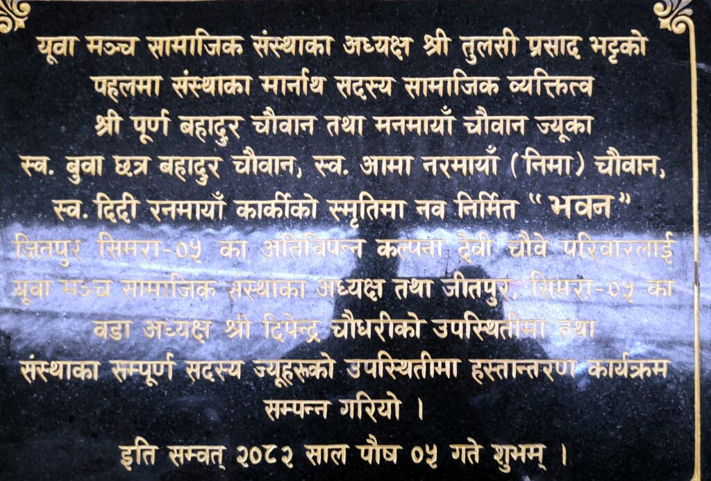 भरतपुर महानगरपालिका–१४ शिवनगर, चितवनस्थित युवा मञ्च सामाजिक संस्थाको सहकार्यमा निर्माण गरिएको उक्त घर संस्थाका मानार्थ सदस्य श्री पूर्ण बहादुर चौवन तथा उनकी धर्मपत्नी मनमाया चौवनका स्वर्गीय बुवा छत्र बहादुर चौवन, स्वर्गीय आमा नर माया (निमा) चौवन र स्वर्गीय दिदी नरमाया कार्कीको स्मृतिमा निर्माण गरिएको हो।
