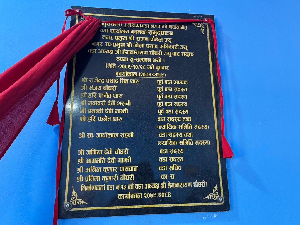 अखिलेश कुमार यादव । माघ २८ सिमरा : बाराको जीतपुरसिमरा उपमहानगरपालिका वडा नं. १३ को नवनिर्मित वडा कार्यालय भवनको बुधबार औपचारिक उद्घाटन गरिएको छ। नगरप्रमुख राजन पौडेलले एक कार्यक्रमबीच भवन उद्घाटन गरेका हुन्। स्थानीय तह स्थापना भएको साढे आठ वर्षपछि वडा नं. १३ ले आफ्नै कार्यालय भवनबाट सेवा प्रवाह सुरु गरेको हो। यसअघि सामुदायिक भवनको साँघुरो कोठाबाट सेवा दिँदै आएको वडा कार्यालय अब सुविधा सम्पन्न पाँच कोठे भवनमा सञ्चालनमा आएको छ। करिब ४५ लाख रुपैयाँको लागतमा भवन निर्माण गरिएको वडाध्यक्ष हेमनारायण चौधरीले जानकारी दिए।