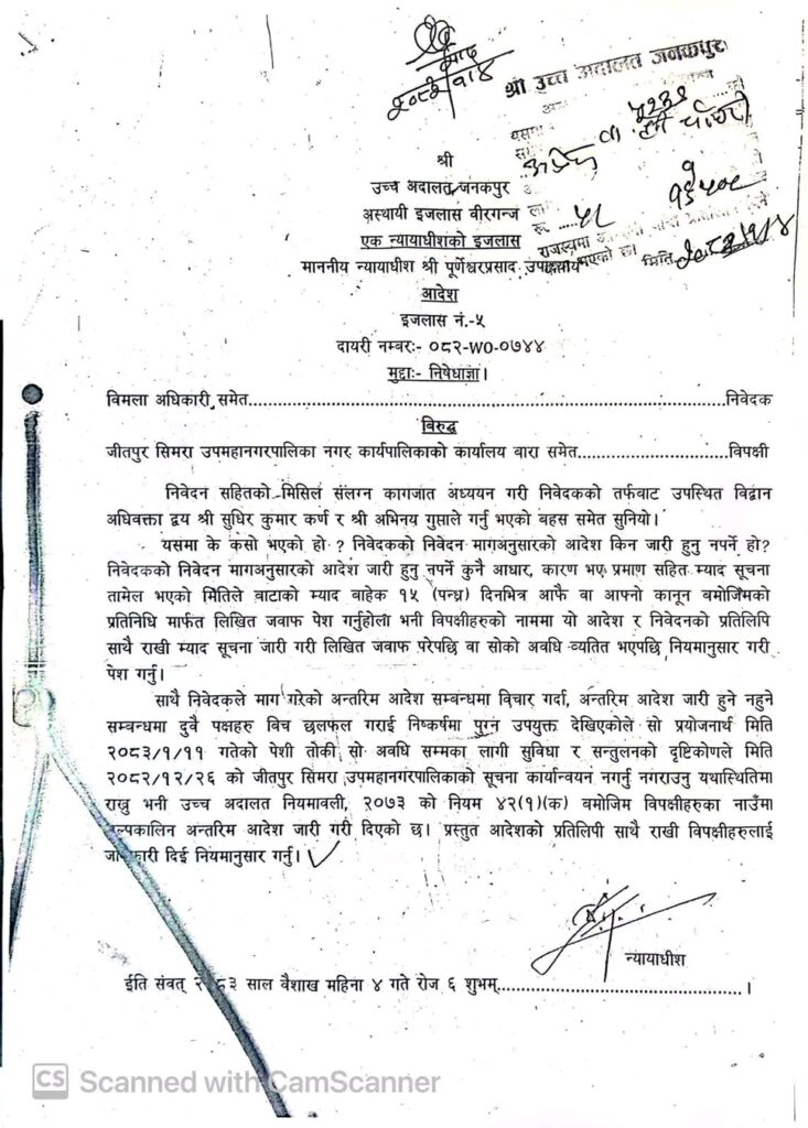 विमला अधिकारीसहितका निवेदकले उपमहानगरको निर्णयविरुद्ध निषेधाज्ञा माग गर्दै अदालतमा निवेदन दिएका थिए। सोही निवेदनमाथि प्रारम्भिक सुनुवाइ गर्दै अदालतले दुवै पक्षबीच छलफल आवश्यक देखिएको भन्दै तत्कालका लागि यथास्थिति कायम राख्न आदेश दिएको हो। अदालतले विपक्षी जीतपुरसिमरा उपमहानगरपालिकासहित सम्बन्धित निकायलाई १५ दिनभित्र लिखित जवाफ पेश गर्न आदेश दिएको छ। साथै अन्तरिम आदेश जारी गर्ने वा नगर्ने विषयमा छलफल गर्न वैशाख ११ गतेको पेशी तोकिएको छ।