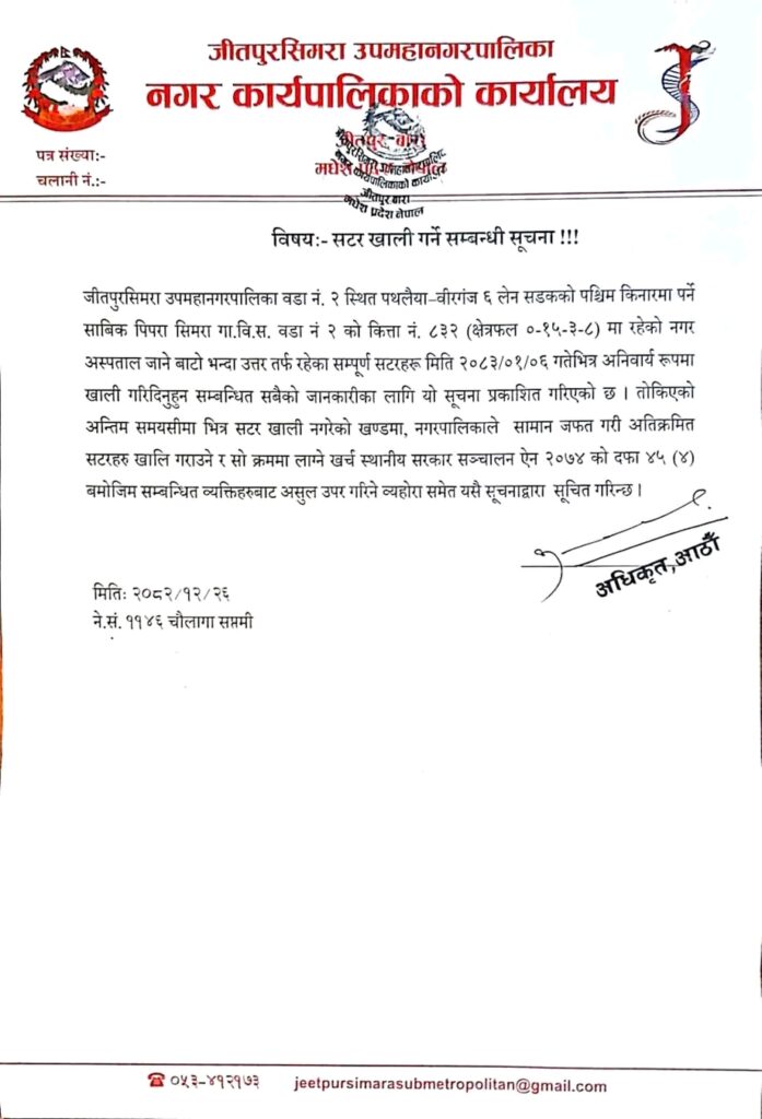 यसअघि उपमहानगरपालिकाले वडा नं. २ अन्तर्गत पथलैया–वीरगञ्ज ६ लेन सडकको पश्चिम किनारमा, नगर अस्पताल जाने बाटोको उत्तरतर्फ रहेका सटरहरू २०८३ वैशाख ६ गतेभित्र अनिवार्य रूपमा खाली गर्न सूचना जारी गरेको थियो।